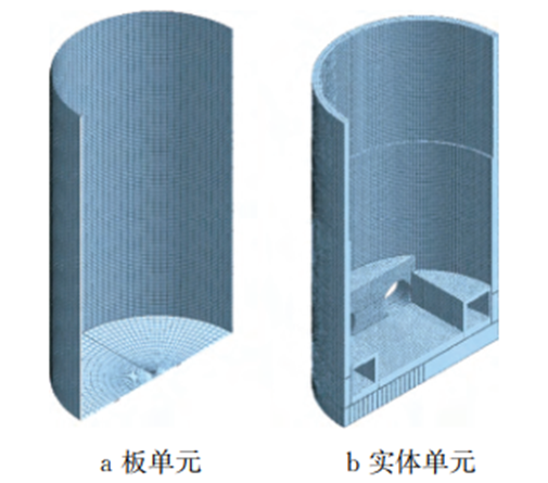 可采用有限元分析软件MIDAS GTS或ANASYS软件建立整体的板单元或实体单元模型(图2),模型主要约束底板外边缘节点,以铰接约束。对应施加各工况下的荷载进行计算。