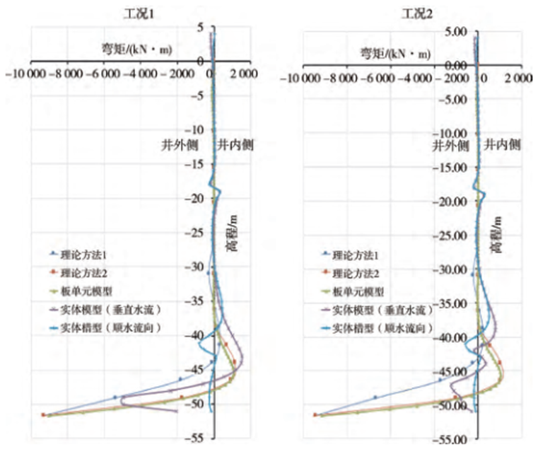 以LG02#工作井计算为例,三种方法的计算结果对比如图3~4所示。可见,三种方法的底板内力结果:板单元模型>理论方法计算>实体单元模型,侧墙内力三种方法计算的变化趋势一致。整体而言,理论方法和板单元模型计算的结果数值偏大,有限元实体单元模型计算结果数值相对较小。设计时可根据实际需求选择上述三种方法的其中一种进行配筋,实体模型能考虑细部结构的刚度影响以及满足变形协调条件,计算结果相对而言更为合理。