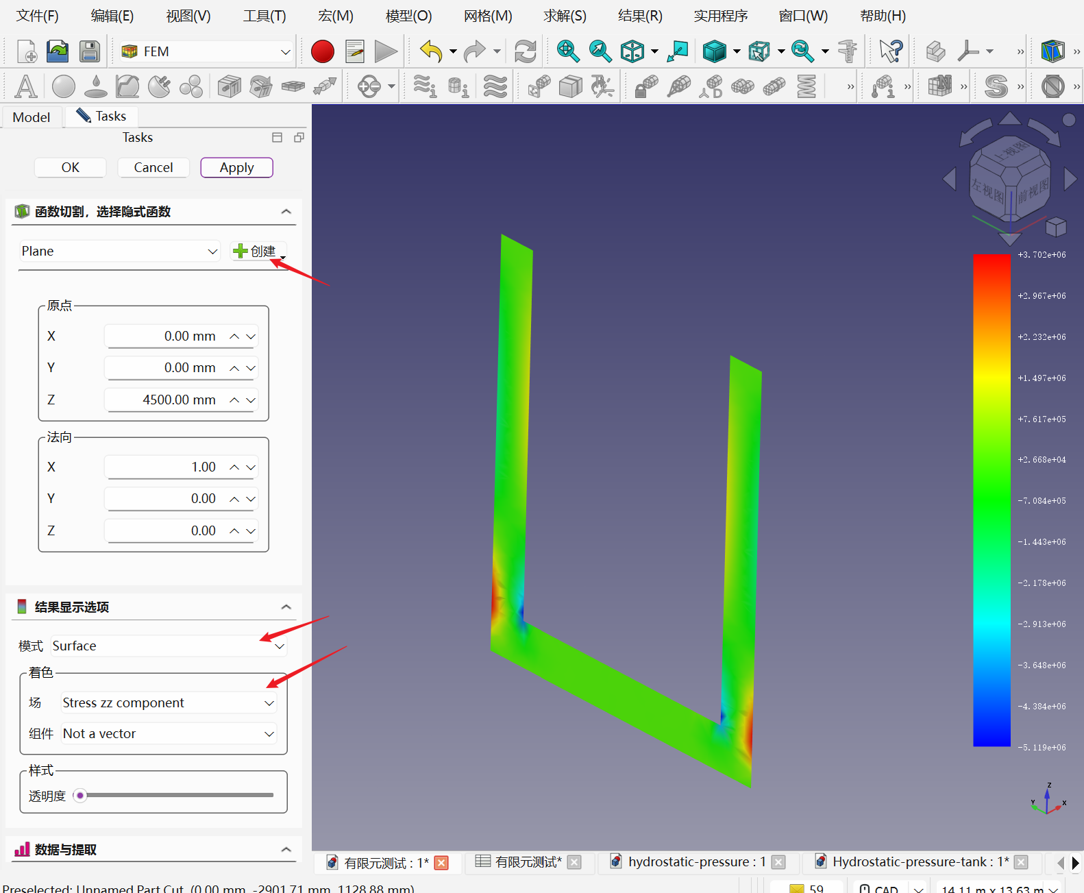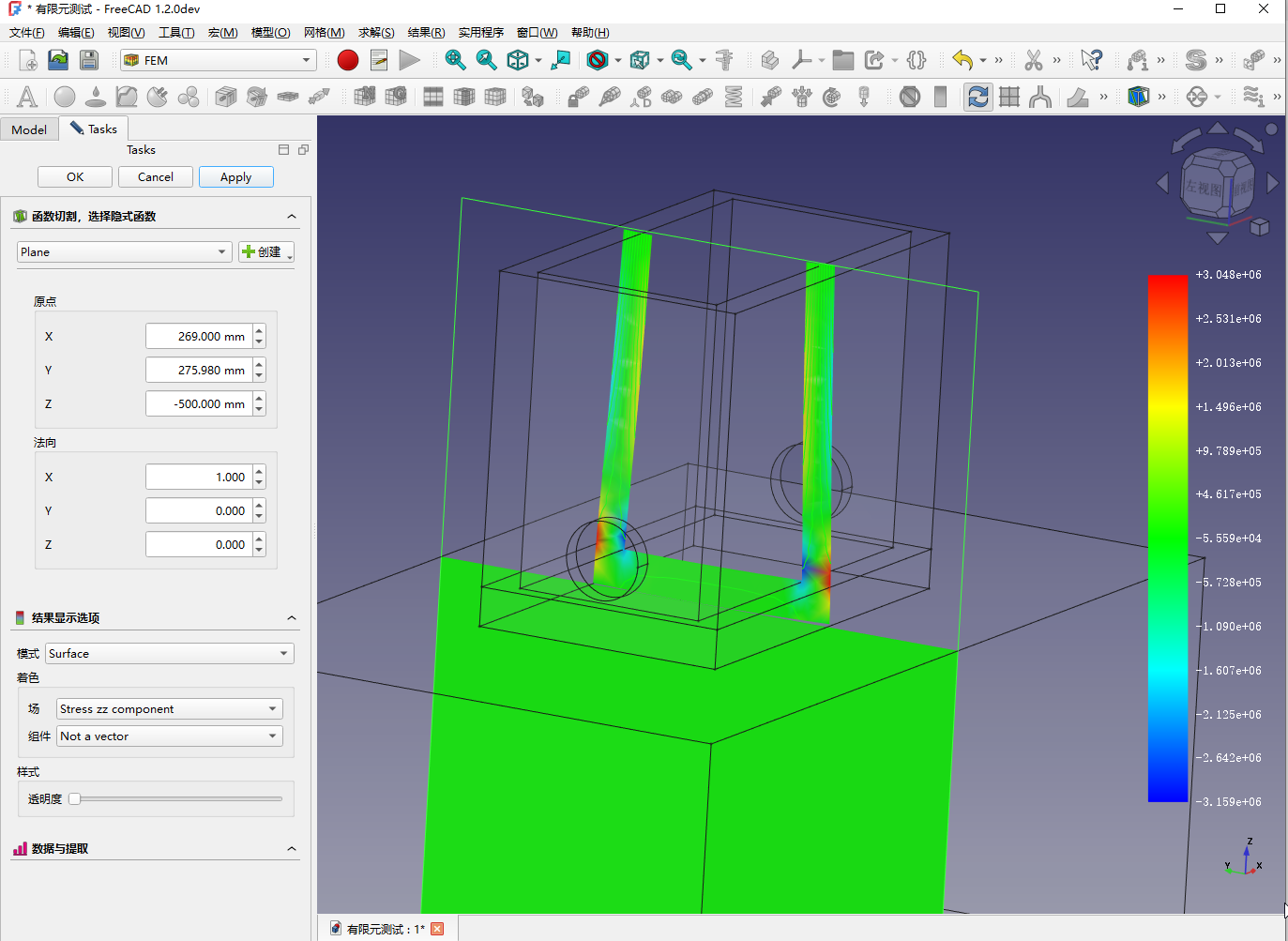 结果展示:z向应力切片和y向应力切片,叠加变形——模型进行透明化