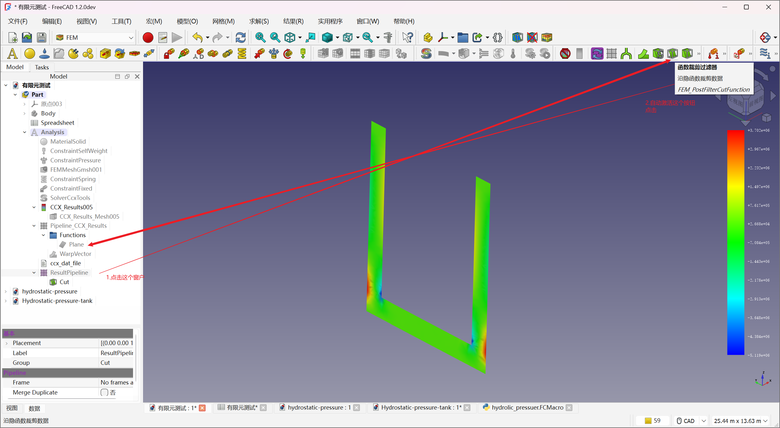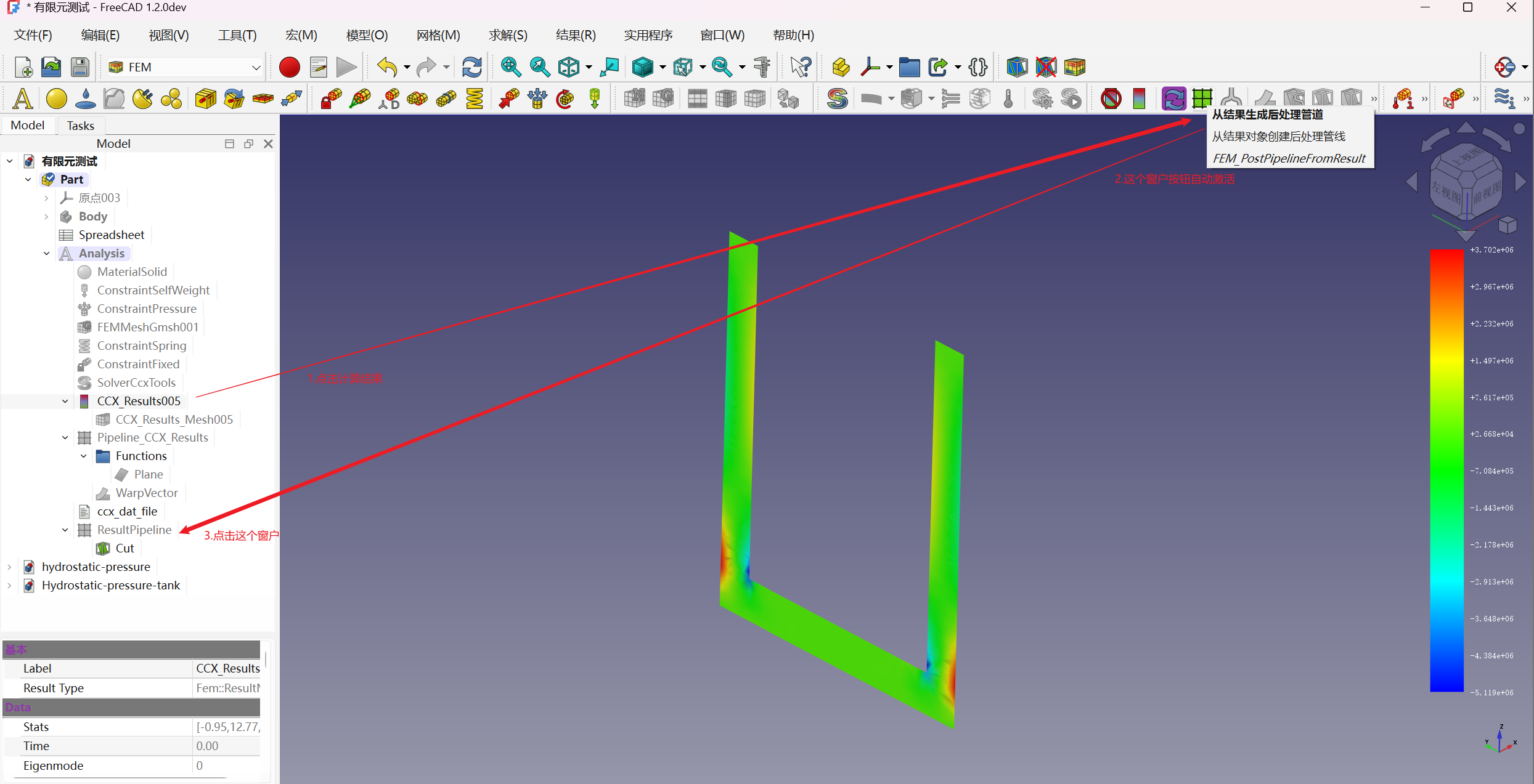 1.点击左侧树状面板上的计算结果ccx_results,自动激活按钮从结果生产后处理管道,点击这个按钮