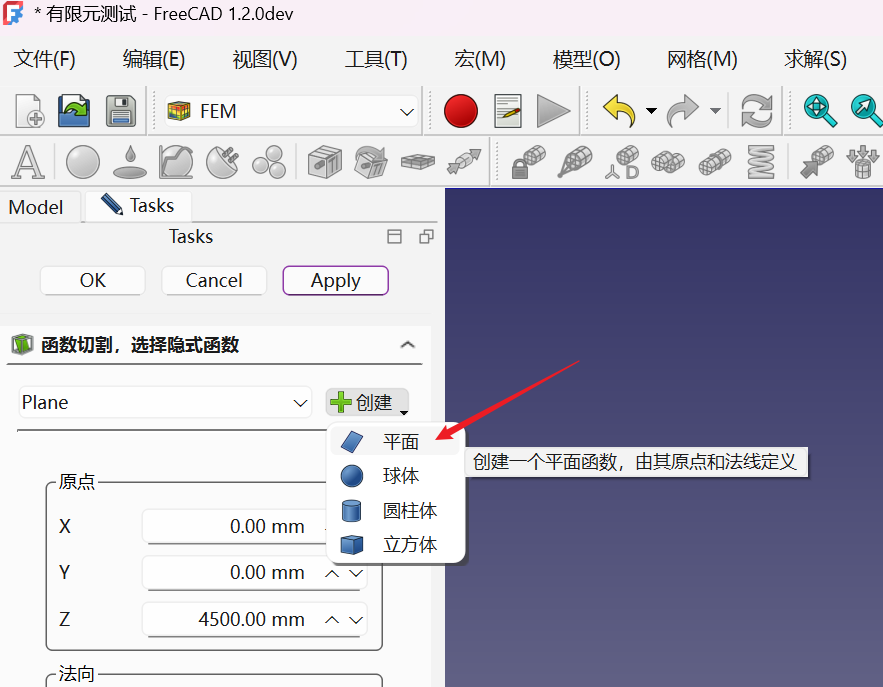 3.点击创建下拉按钮,选择平面,出来一个辅助切面控制的操作图形