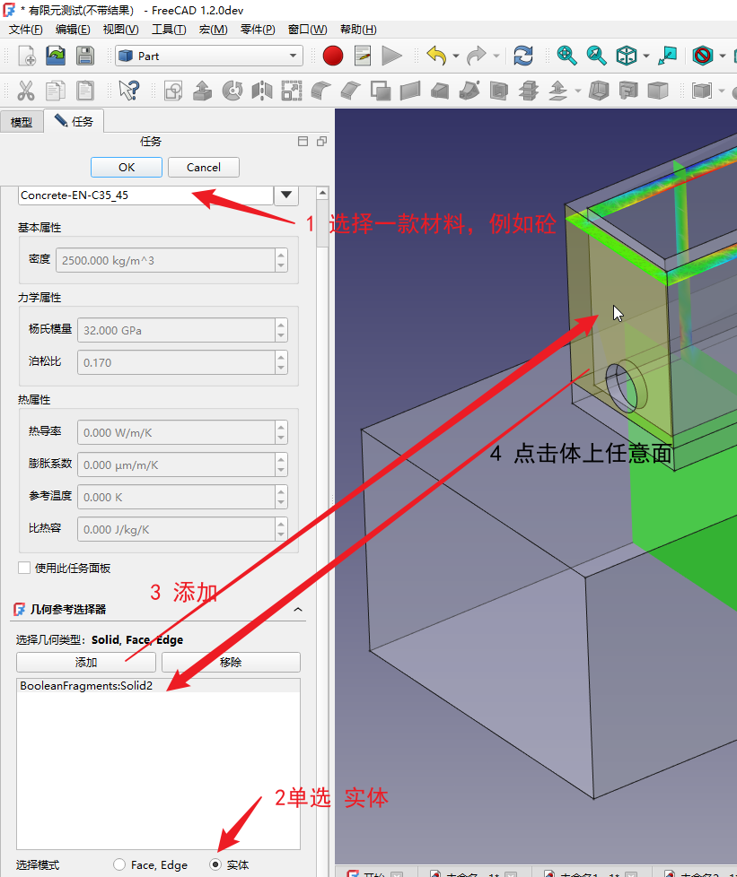 点击材料按钮,选择一个材料。再拉到最底下,选中solid单选,点击添加按钮,在体上随便点一个面,这个材料就赋予这个体上了BoleanFragments.Solid2。