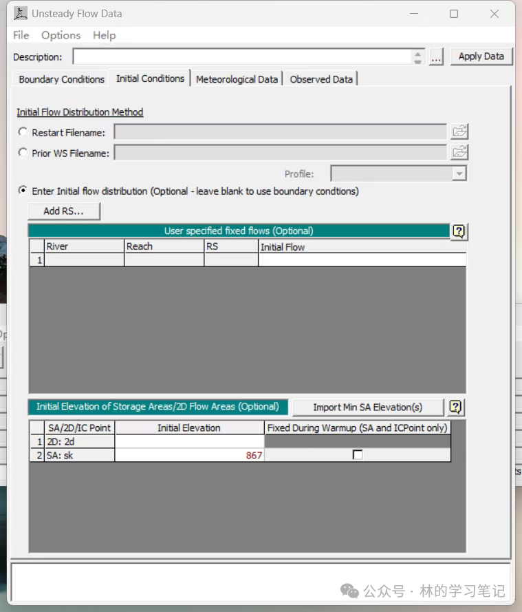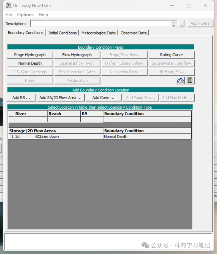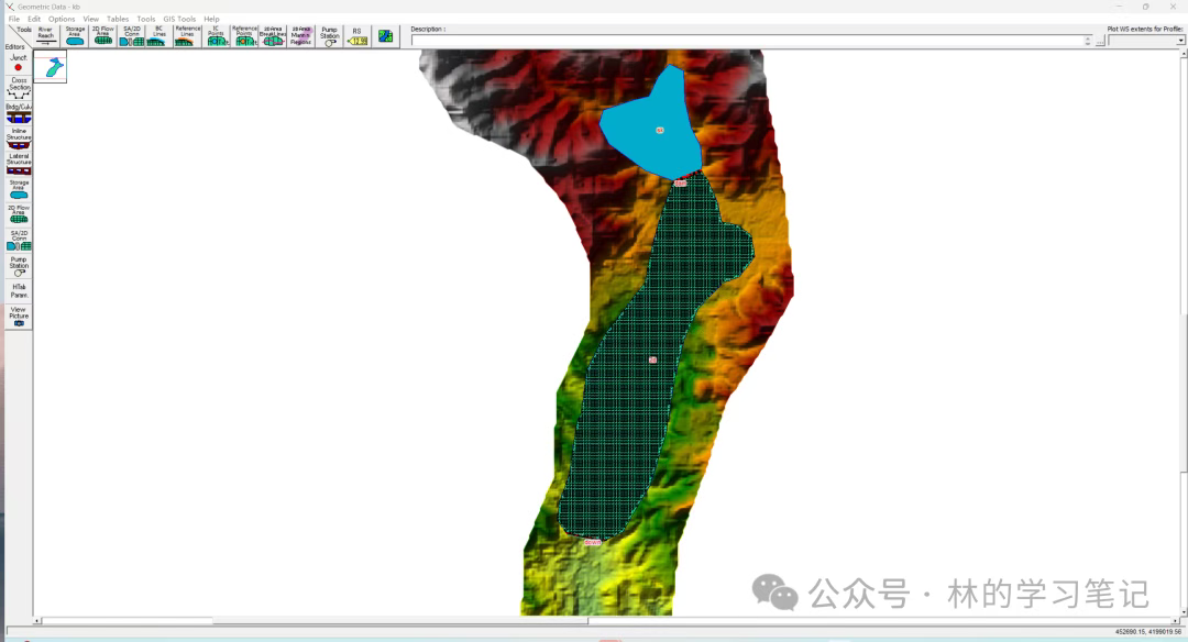 新建一个hecras投影文件,从rasmapper里导入dem数据。在edit geometry data里设定几何数据,包括水库范围,下游2d的淹没区,水力边界以及大坝结构。