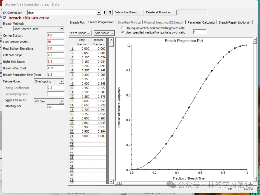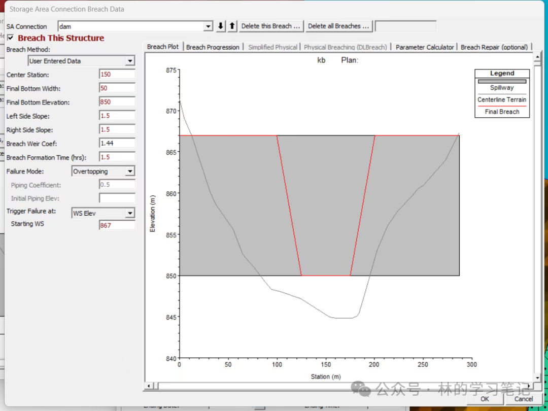 在大坝结构设定界面中点击breach弹出溃口设置界面,并勾选breach this structure。左侧参数输入栏中输入溃口参数。可以利用经验公式计算溃坝参数,也可以输入大坝参数利用hecras内置模型计算溃坝参数(点击parameter calculator输入参数和模型后自动得出)。本示例中是自己计算后手动输入,溃口参数见图。