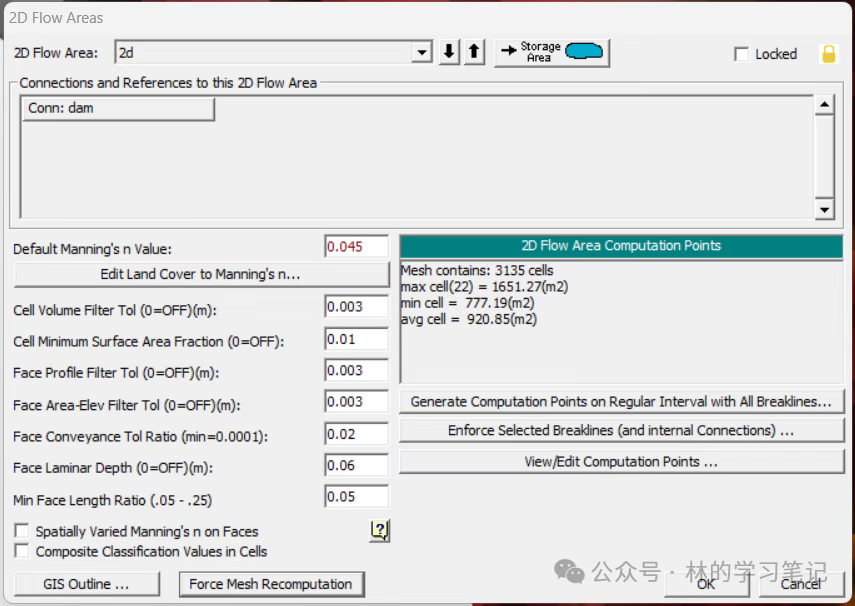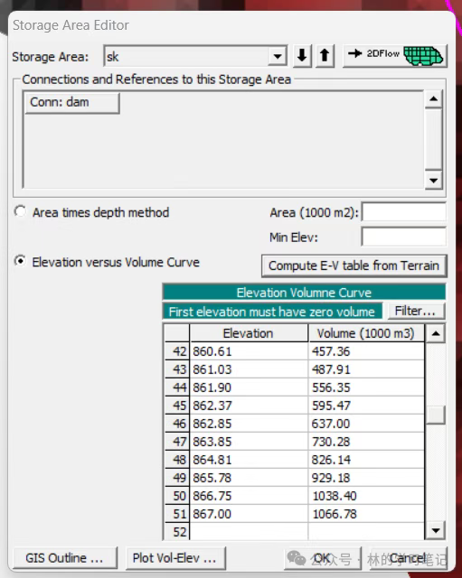 (1)水库为storage area,左键点击绘制好的区域进行编辑,可以设定好坝高后自动计算水位库容曲线并填入。