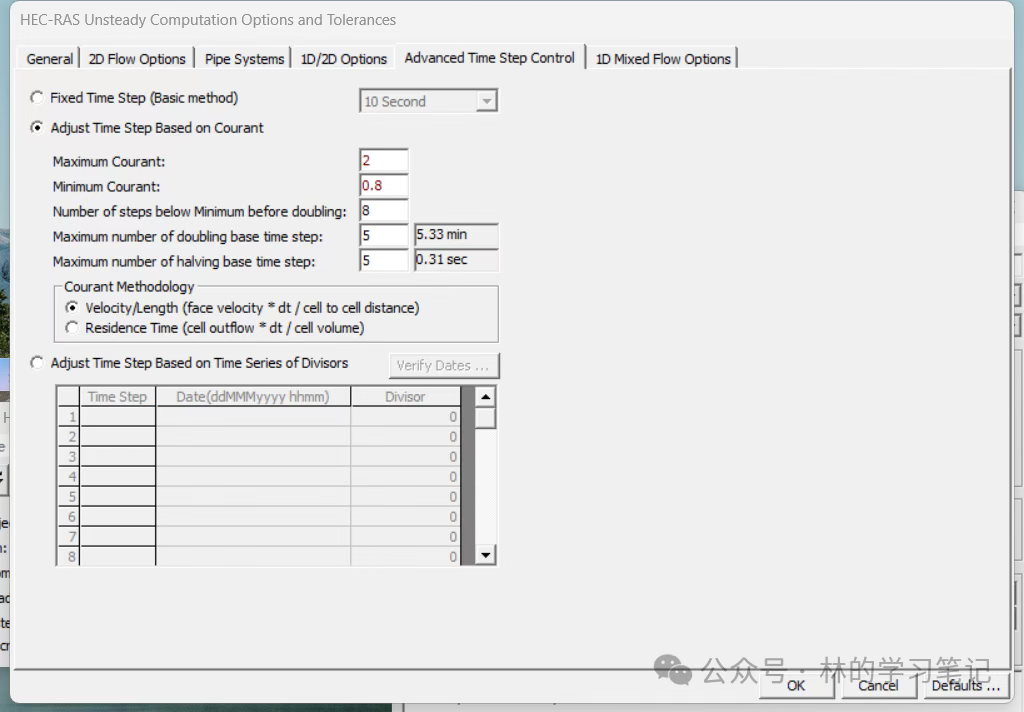 在options-computation options and tolerances中进行计算设定容差和计算方程等,本次均采用默认。为使模型稳定,本次在advanced time step control中设定自适应步长,将库朗数最大设置为2,最小设置为0.8。