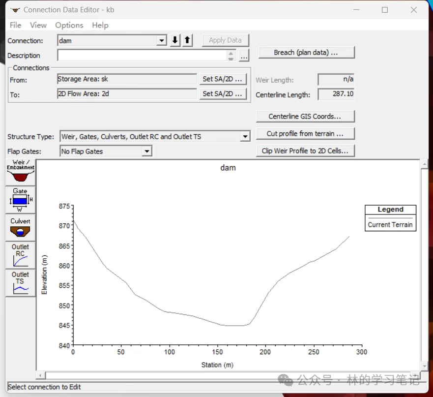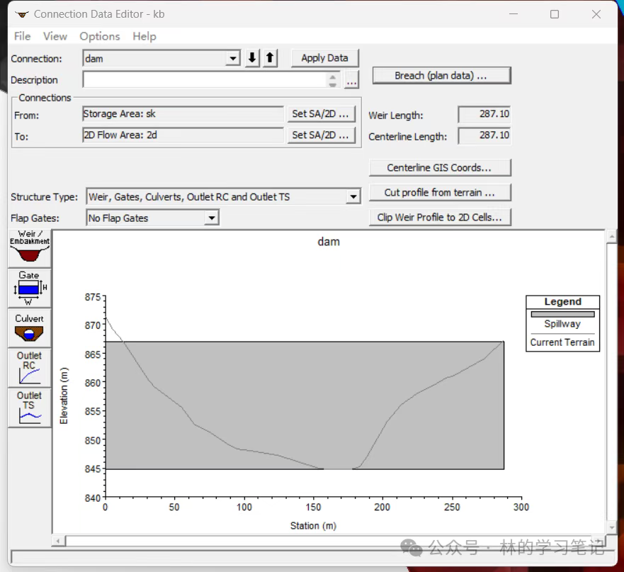 3.大坝结构是connection data editor,坝体在weir 中设定,这里堰流系数取默认。