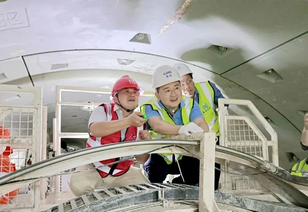 2021年4月19日下午,粤海集团副总经理陈秉恒到顺德段A2标LG02#工作井工区听取了项目施工进度、管片制造、科技环保、安全管控、工程重难点及存在问题等情况的汇报。在LG02#工作井工区,一行人搭乘施工电梯深入57.5米工作井,进入隧洞察看了盾构施工情况,详细了解了盾构穿越大金山复杂地质情况、刀具磨损、科研攻关的情况。陈秉恒还登上盾构机管片拼装平台,察看盾构换刀作业,询问了换刀流程及数据参数。他对项目部攻坚克难、锐意进取的拼搏精神表示肯定,特别是对A2标项目务实担当、迎难而上、技术创新的工作态度表示赞扬。