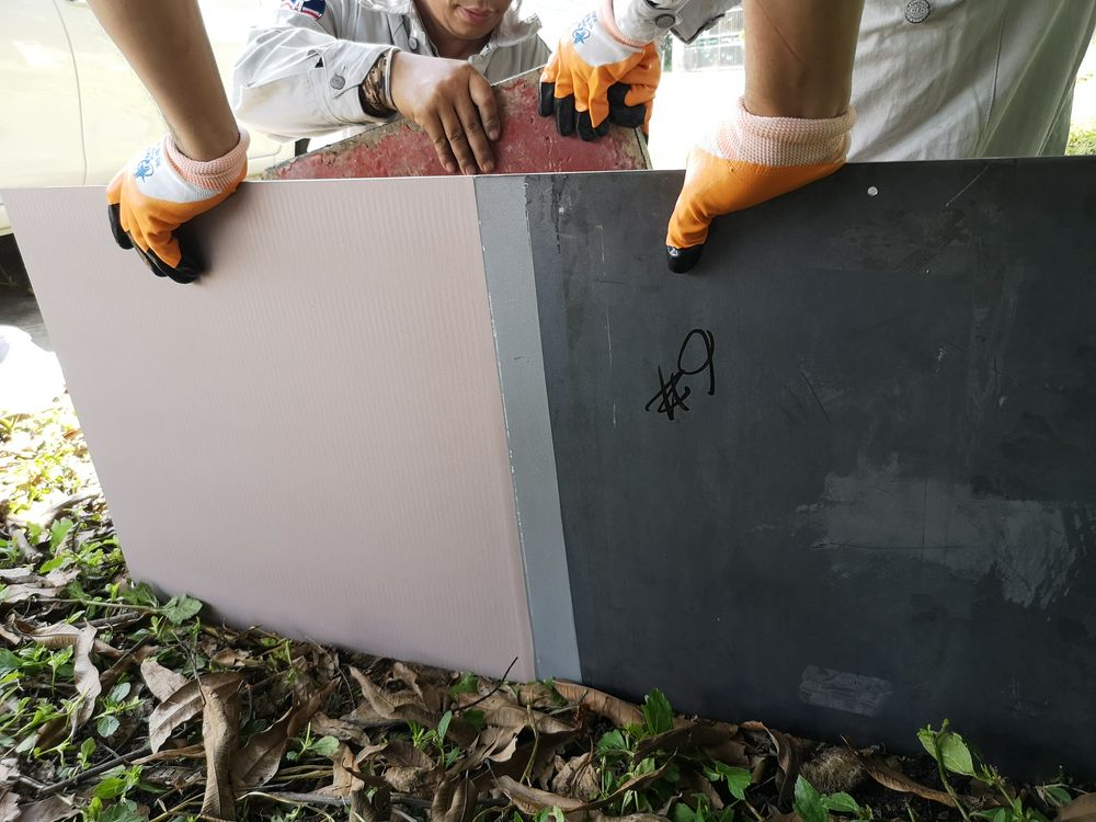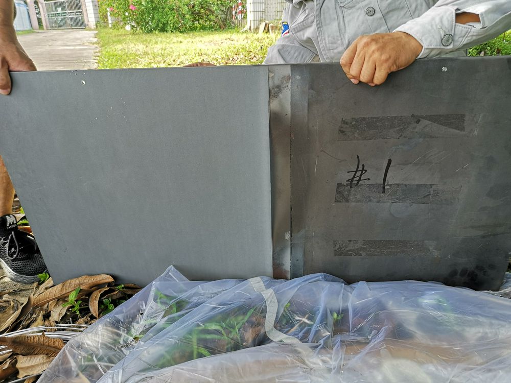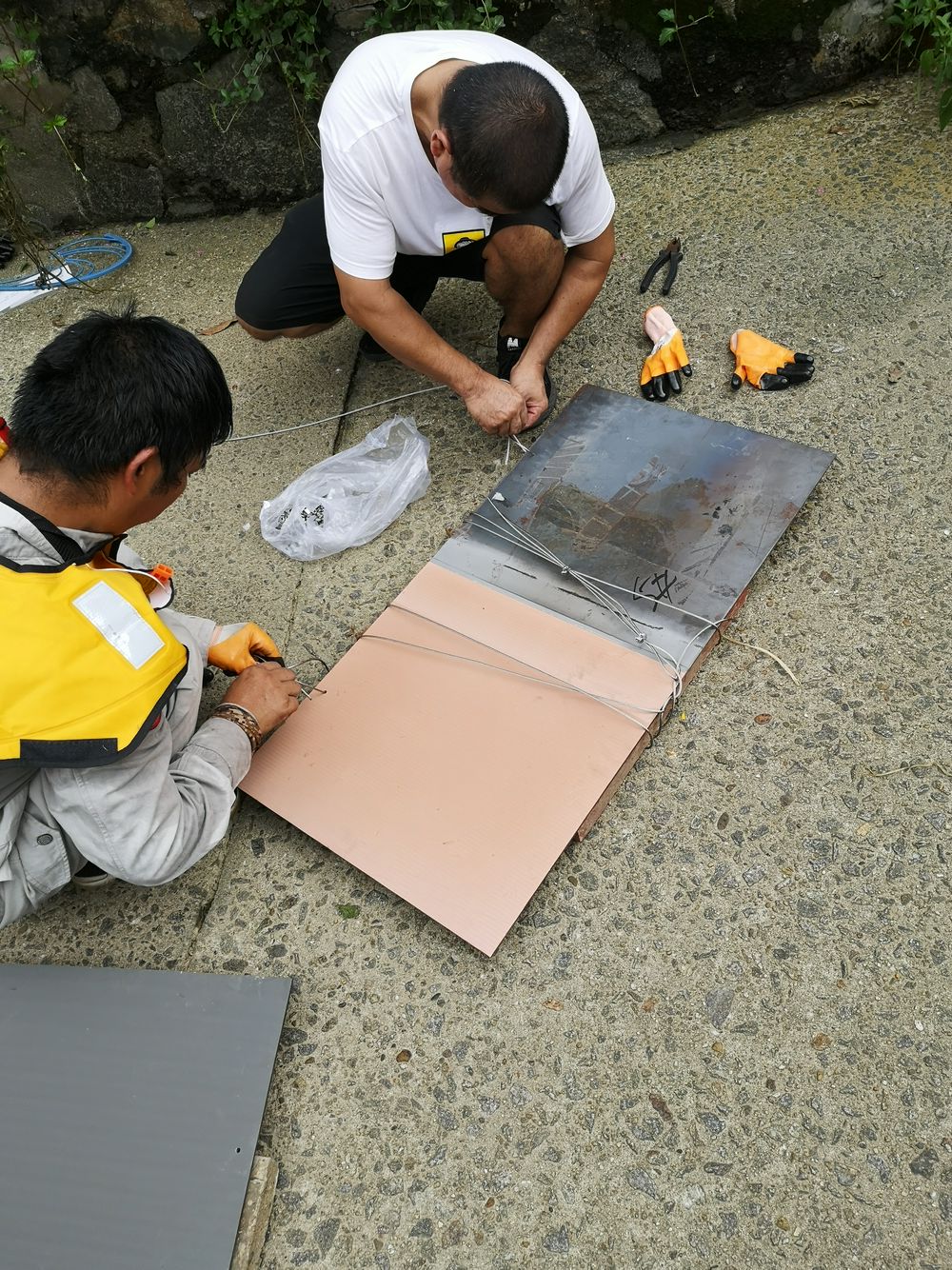 8月28日,一早将7块挂板运到东莞桥头镇太园泵站太园反虹涵出口处,进行绑扎配重块,沉放入水。为某些项目运管储备技术,经过十年浸泡,看看效果。