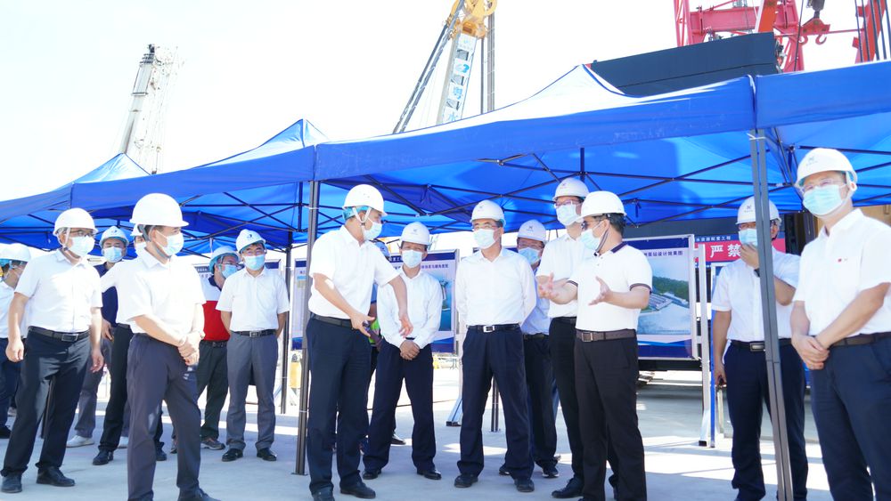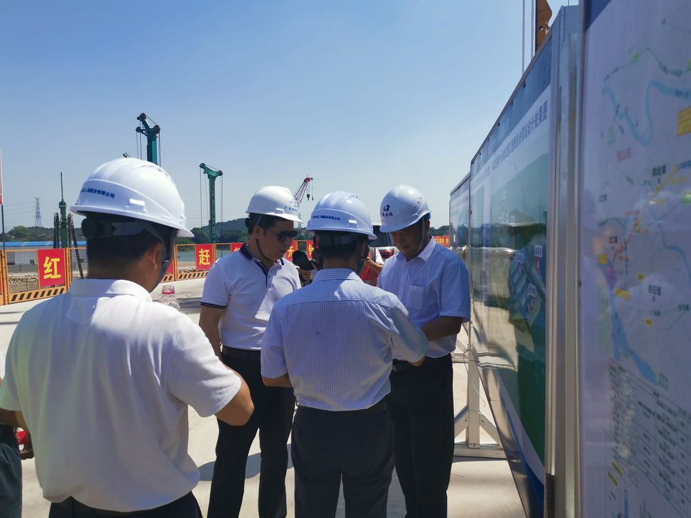 张福海一行首先来到土建A1标鲤鱼洲泵站施工现场检查,实地查看泵站机组安装、高位水池和蝶阀井围护结构连续墙铣槽工艺建设进展情况,在现场听取珠三角供水公司总经理杜灿阳、珠三角项目设计负责人严振瑞介绍工程设计总体概况、进度、鲤鱼洲取水泵站枢纽布置等情况汇报。
