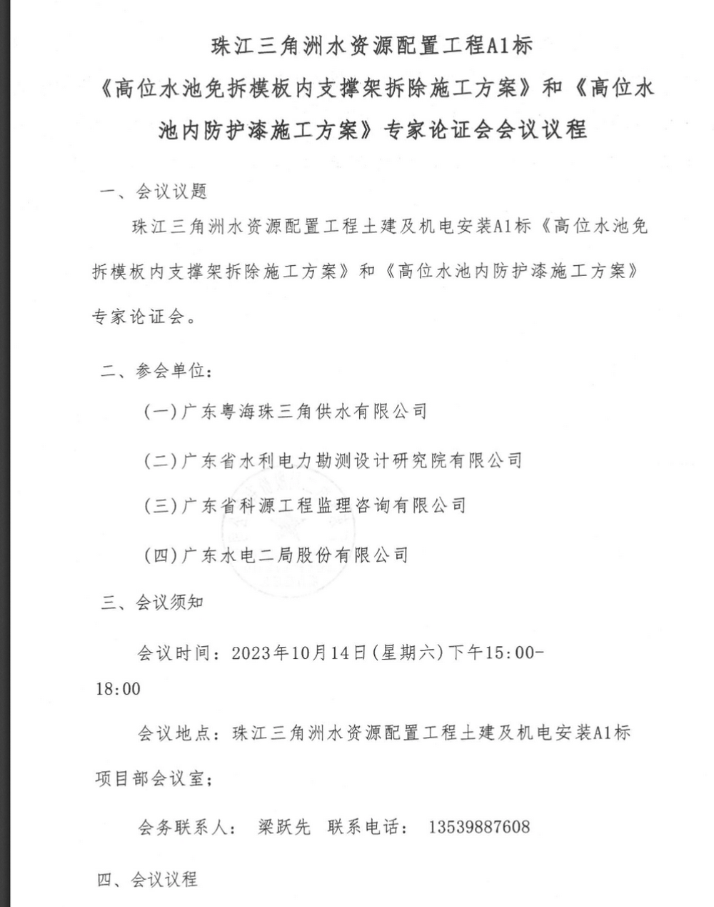 2023年10月14日,A1标鲤鱼洲高位水池专项施工方案评审会议