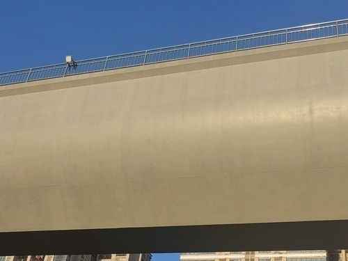 2019年至今4年多日晒雨淋,一尘不染如此光亮,配合独特的槽身线型,在冬日下午的阳光下,现场感受这悬空的庞然大物十分震撼。这样好的效果在于以下几点:1.砼基面打磨仔细。2.底漆中间漆面漆坚持做5道。3.盲选氟碳漆里含氟量最高的产品。4.施工队伍专业且值得信赖。