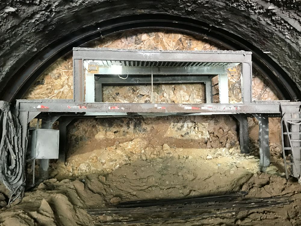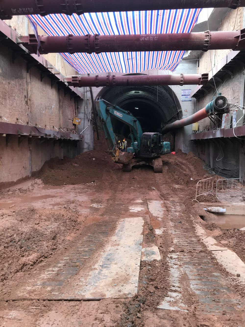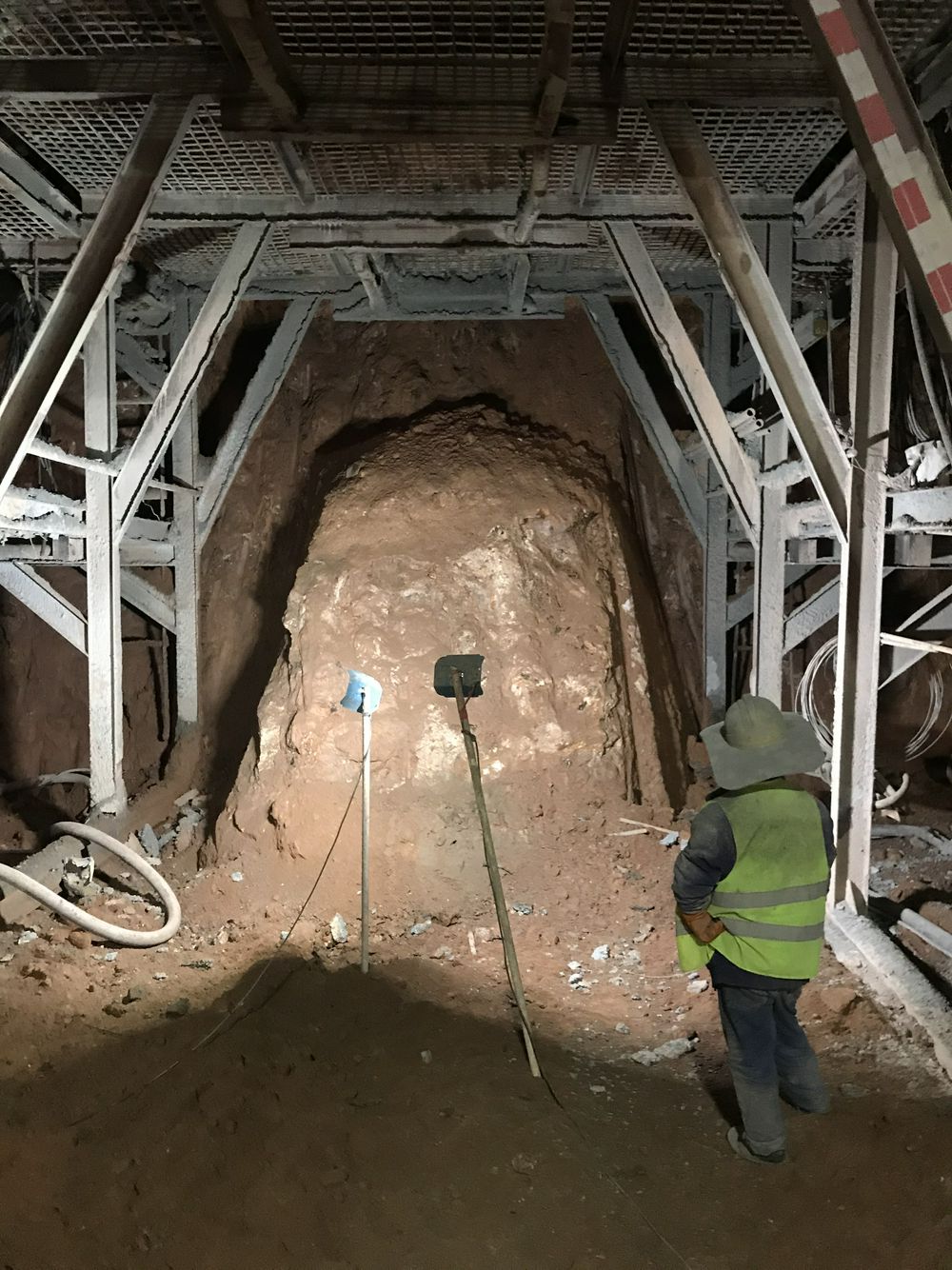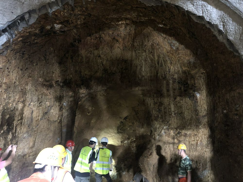 杨屋检修交通洞开挖至桩号0+809,进洞150m,掌子面为全风化石英岩,中下部夹较多强风化岩块,右下方有弱风化岩出露,围岩类别为V类;