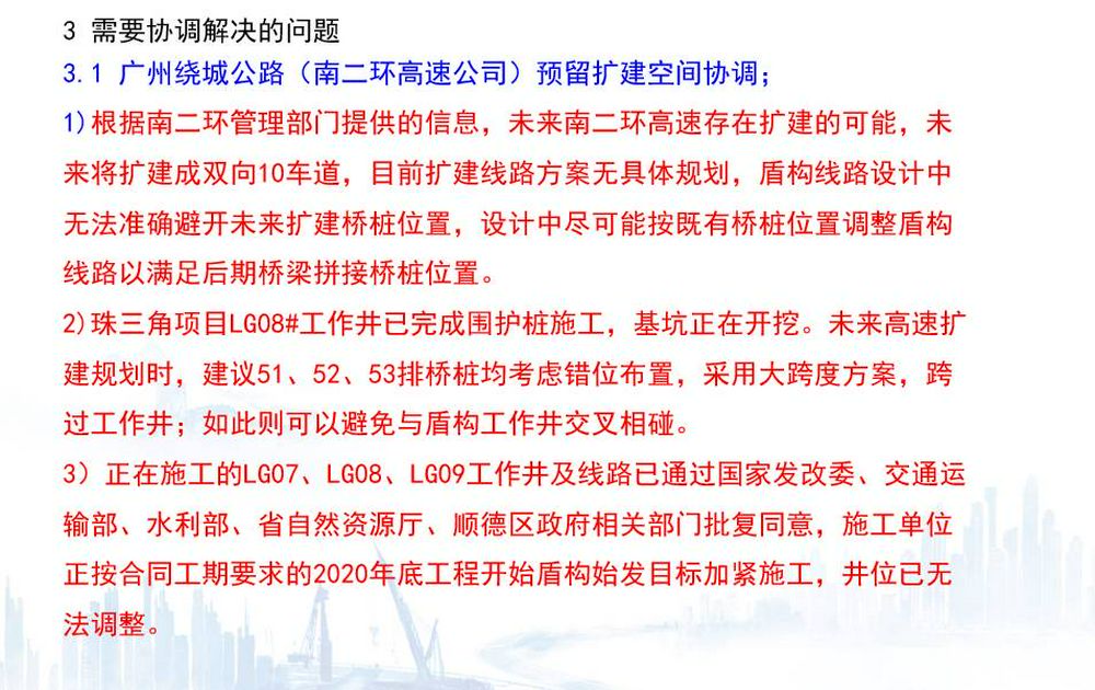 2.在广进汽车城平行南二环段,需预留双十扩建空间,预留宽度9.25米拓宽规划,后续桥梁桩基距离输水隧洞结构边线的保护范围,由珠三角公司提出输水隧洞的保护要求,预留空间。